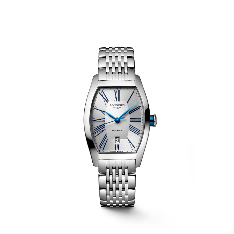 Encased in a distinctive tonneau-shaped stainless steel case measuring 26 × 30.60 mm, the timepiece offers a poised and sophisticated presence on the wrist. Powering the watch is a self-winding automatic mechanical movement beating at 28,800 vibrations per hour and providing a power reserve of up to 45 hours, reflecting Longines’ commitment to enduring precision.